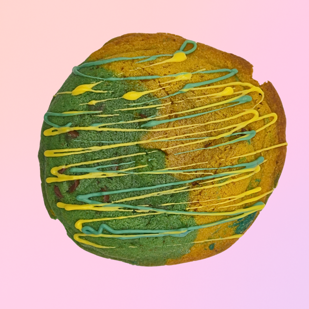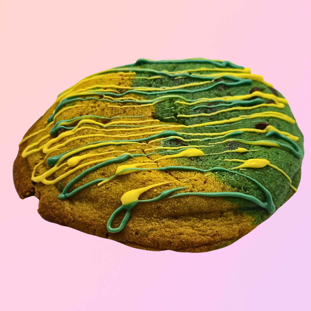 Un délice irrésistible, inspiré du célèbre chocolat de Dubaï. Ce cookie bicolore vert et jaune renferme un cœur pistache fondant. Chaque bouchée offre un équilibre parfait entre le croquant à l’extérieur et le moelleux à l’intérieur, surmonté d’un nappage gourmand au chocolat blanc et de fines rayures colorées.